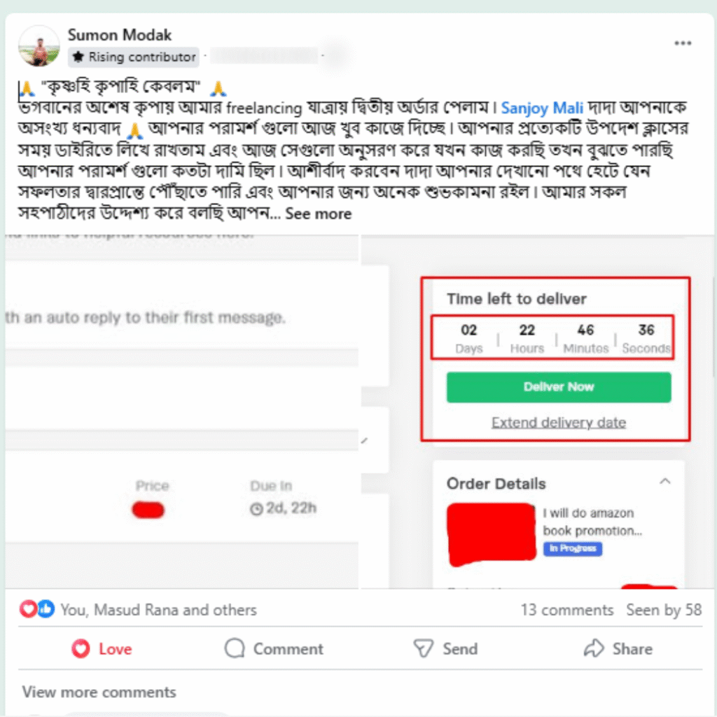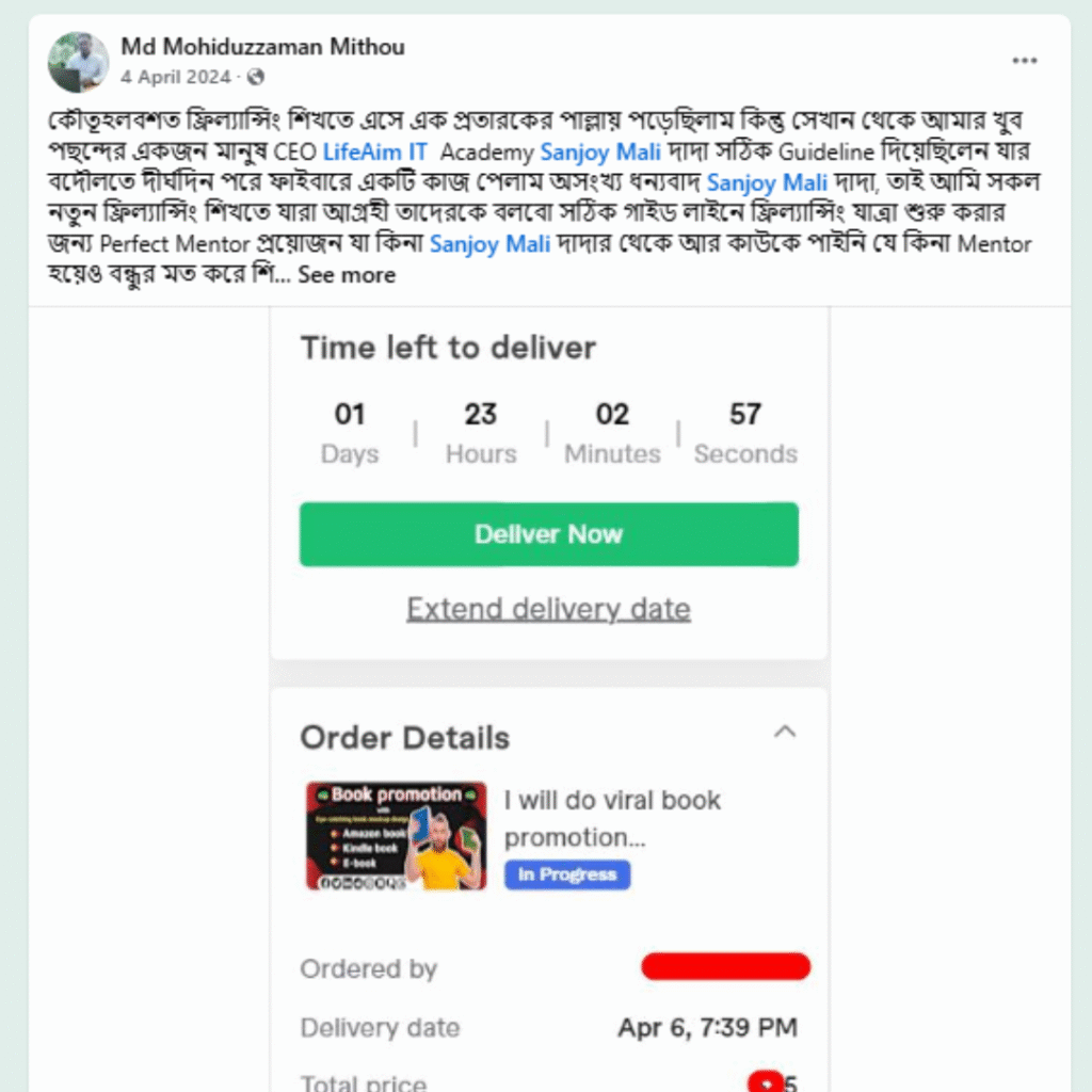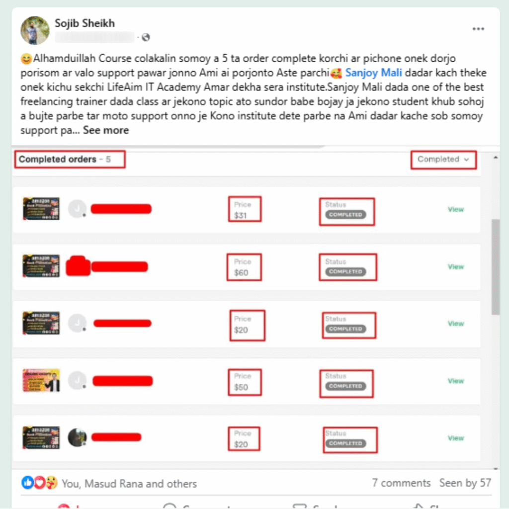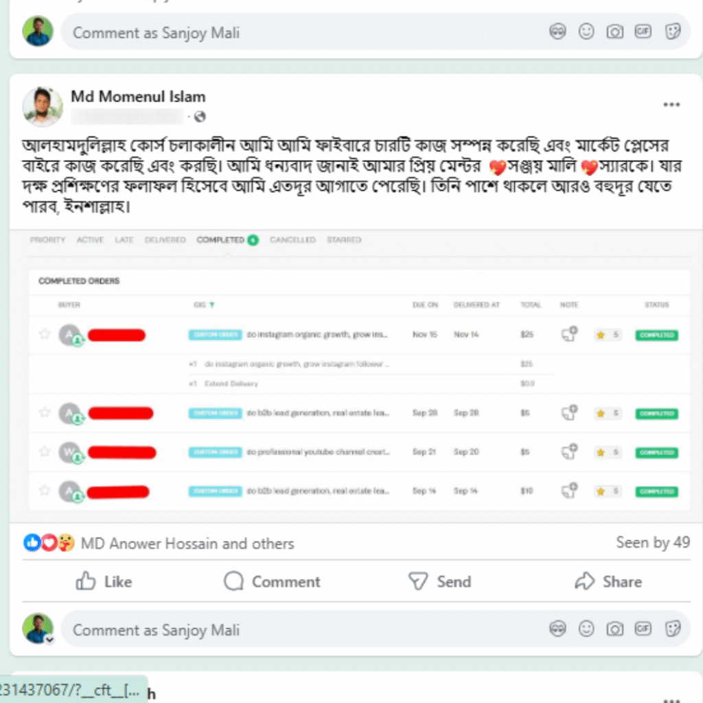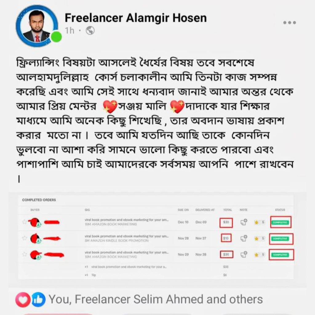 এই যাত্রায় আমি বুঝেছি, সঠিক গাইডলাইন পেলে যে কেউই ফ্রিল্যান্সিংয়ে সফল হতে পারে। তাই এখন আমি শুধু নিজে কাজই করি না, বরং অন্যদেরও শেখাই – যেন তোমরাও নিজের মতো করে ইনকাম করতে পারো, নিজের ক্যারিয়ার বানাতে পারো।