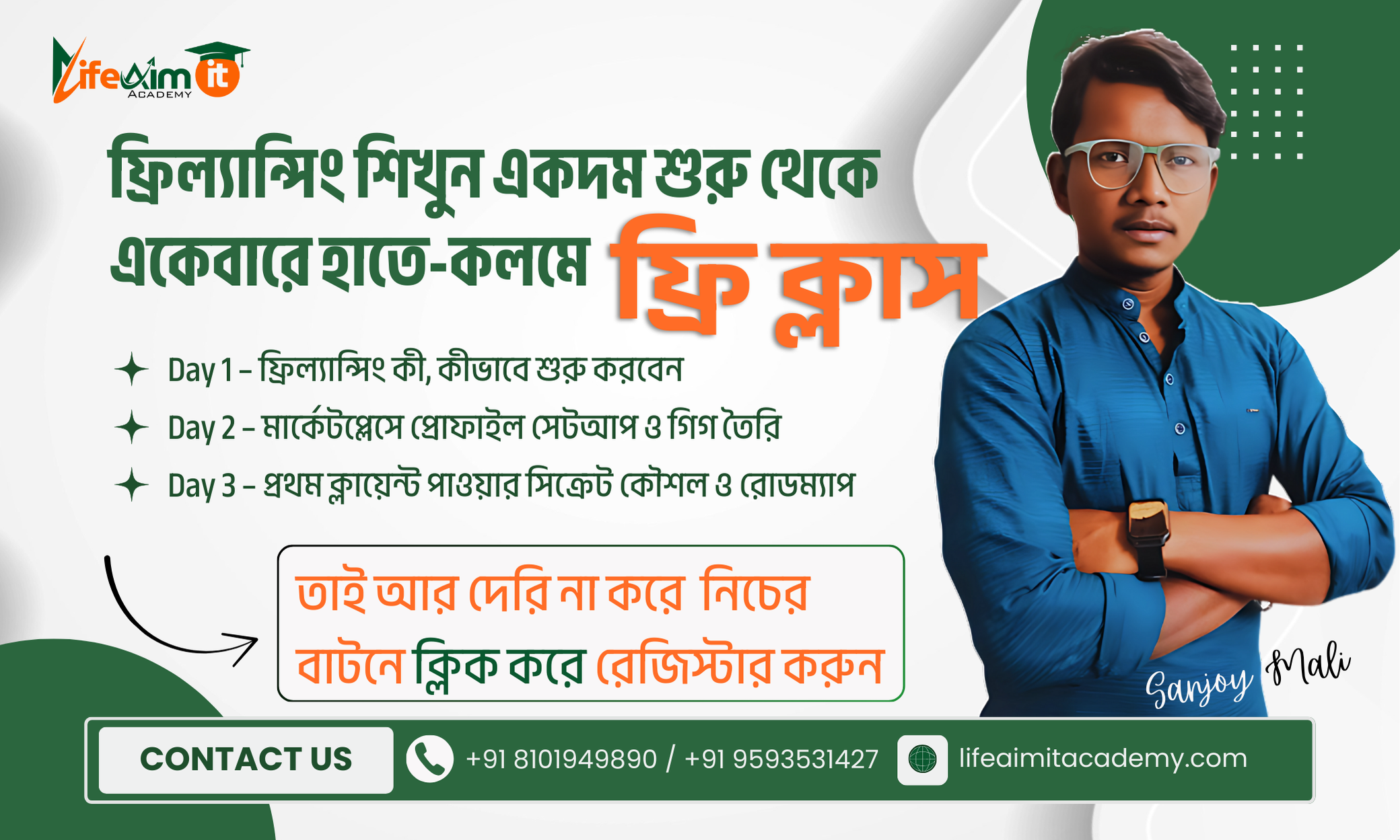 এই এক্সক্লুসিভ ৩-দিনের লাইভ মাস্টারক্লাসে শিখুন সেরা ফ্রিল্যান্সিং কৌশল টিপস এবং ট্রিক্স, ক্লায়েন্ট আনা থেকে শুরু করে ক্লায়েন্ট ক্লোজ অব্দি আমরাই শেখাবো